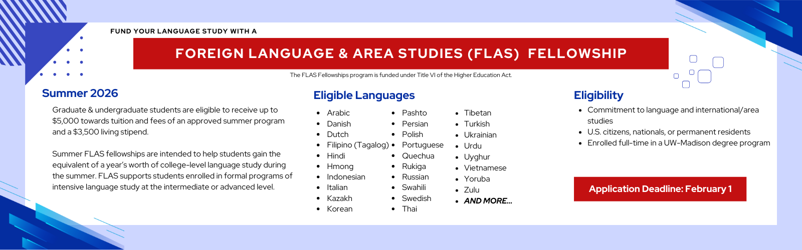 Additional details about FLAS at UW-Madison are available on the FLAS FAQ page, by contacting awards@iris.wisc.edu, and from the appropriate FLAS coordinators.